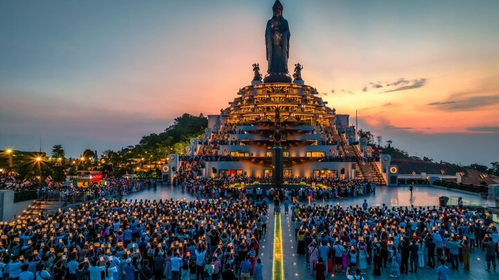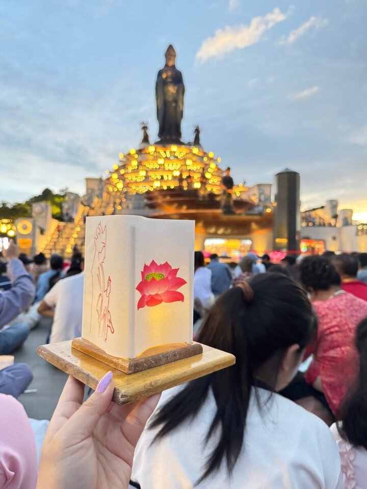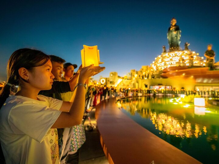Dưới ánh sáng vàng ấm áp từ hệ thống công trình tâm linh kỳ vĩ, từng gương mặt dõi theo ánh hoa đăng đều ánh lên vẻ thành kính. Điều khiến nhiều người xúc động chính là cảm giác được hoà mình vào một cộng đồng tâm linh không phân biệt tuổi tác, nghề nghiệp hay vùng miền. Mỗi người đến đây với một mong ước riêng, nhưng khi cùng hướng lòng về điều tốt lành, một dòng chảy năng lượng tích cực được lan toả lặng lẽ mà sâu sắc.